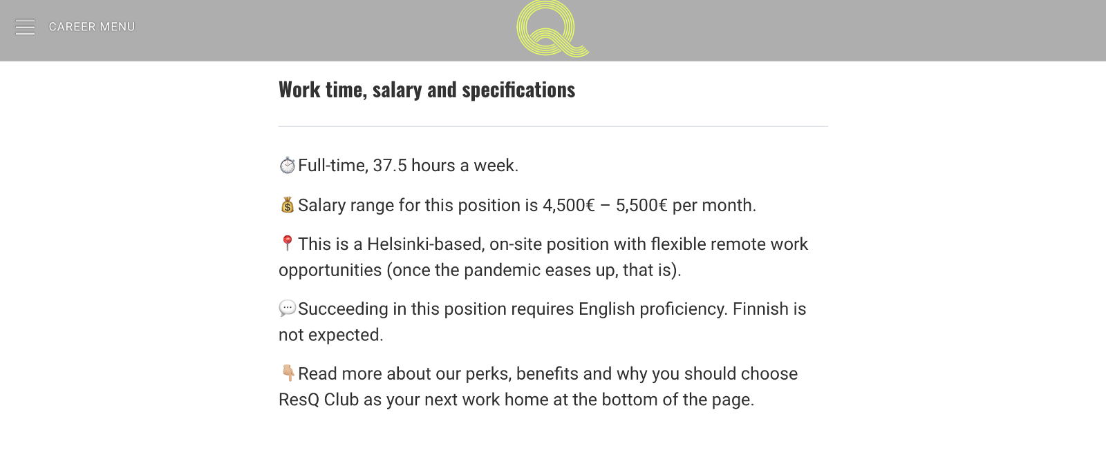 If your company does not obviously operate within the technology industry, detailing your tech stack might give you the edge over a tech company. At the same time, being specific about the technology your company uses helps weed out unsuitable candidates. Those without experience with specific tools will either not apply or have an idea of areas in which they may need to broaden their qualifications.